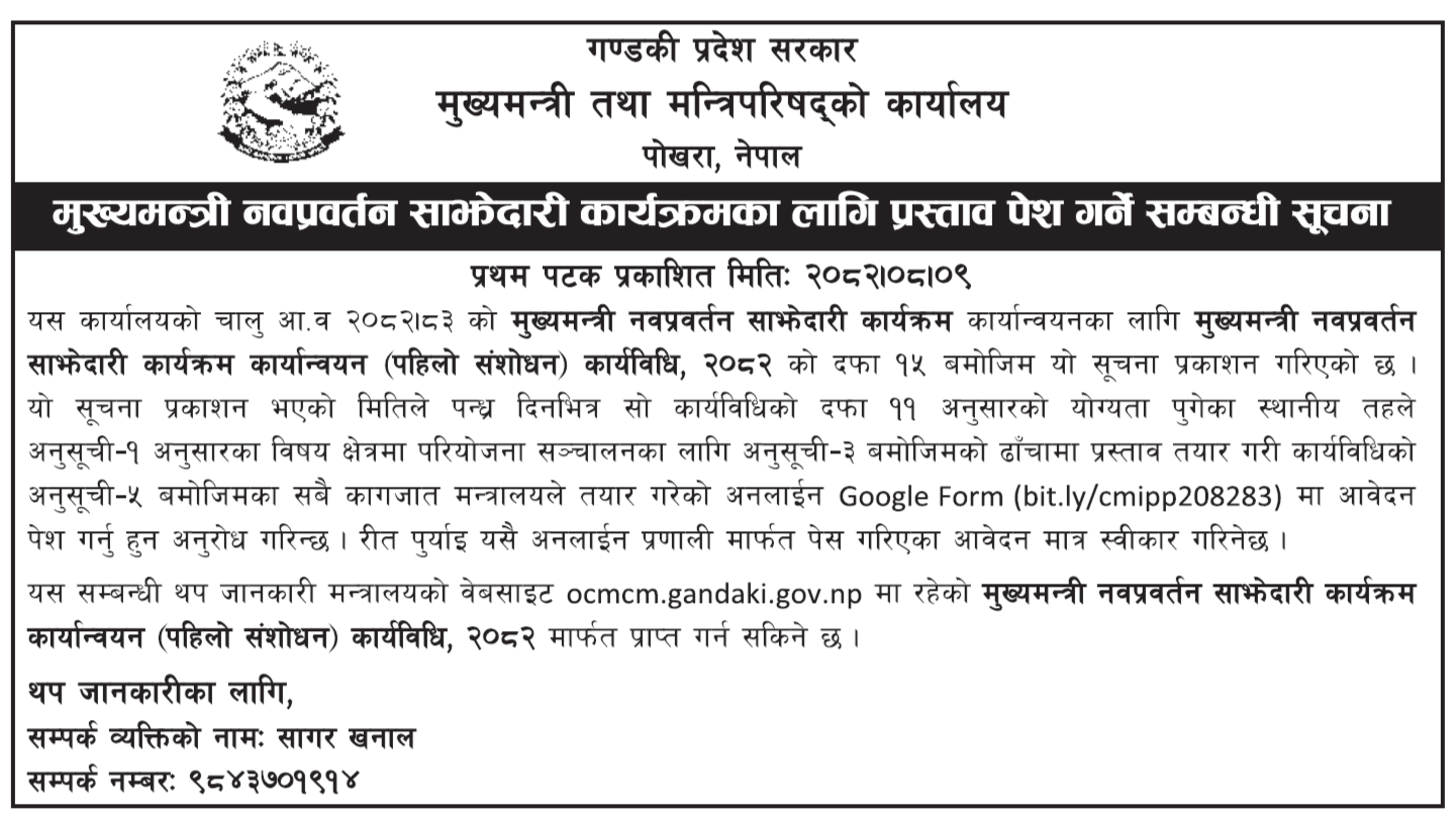 Download: मुख्यमन्त्री नवप्रवर्तन साझेदारी कार्यक्रमका लागि प्रस्ताव पेश गर्ने सम्बन्धी सूचना