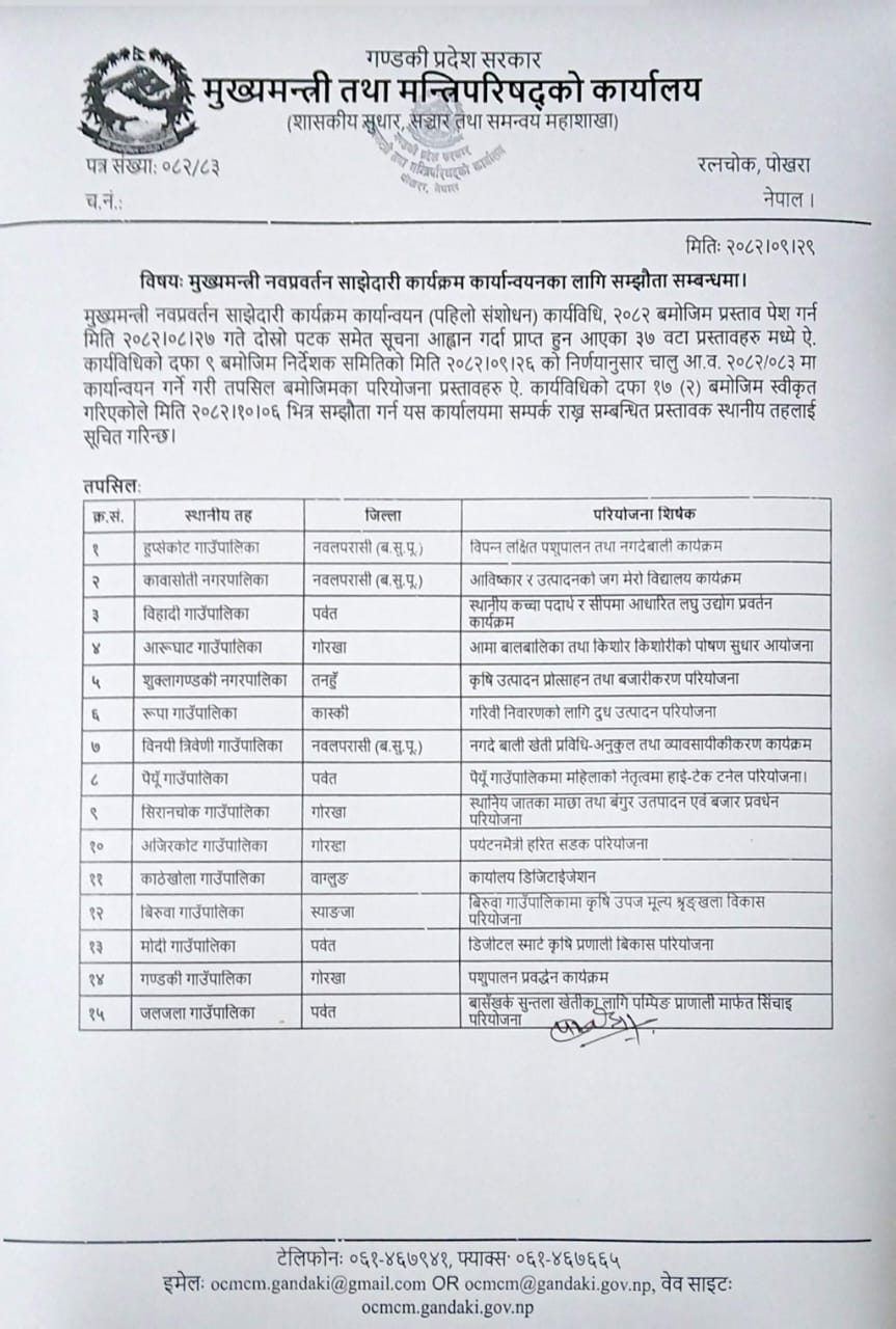 आ.व. ०८२/०८३का लागि मुख्यमन्त्री नवप्रवर्तन साझेदारी कार्यक्रममा परियोजना प्रस्ताव छनौट गरिएको सम्बन्धि सूचना।